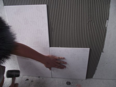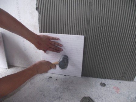 7. 將瓷磚揉壓于粘結劑上